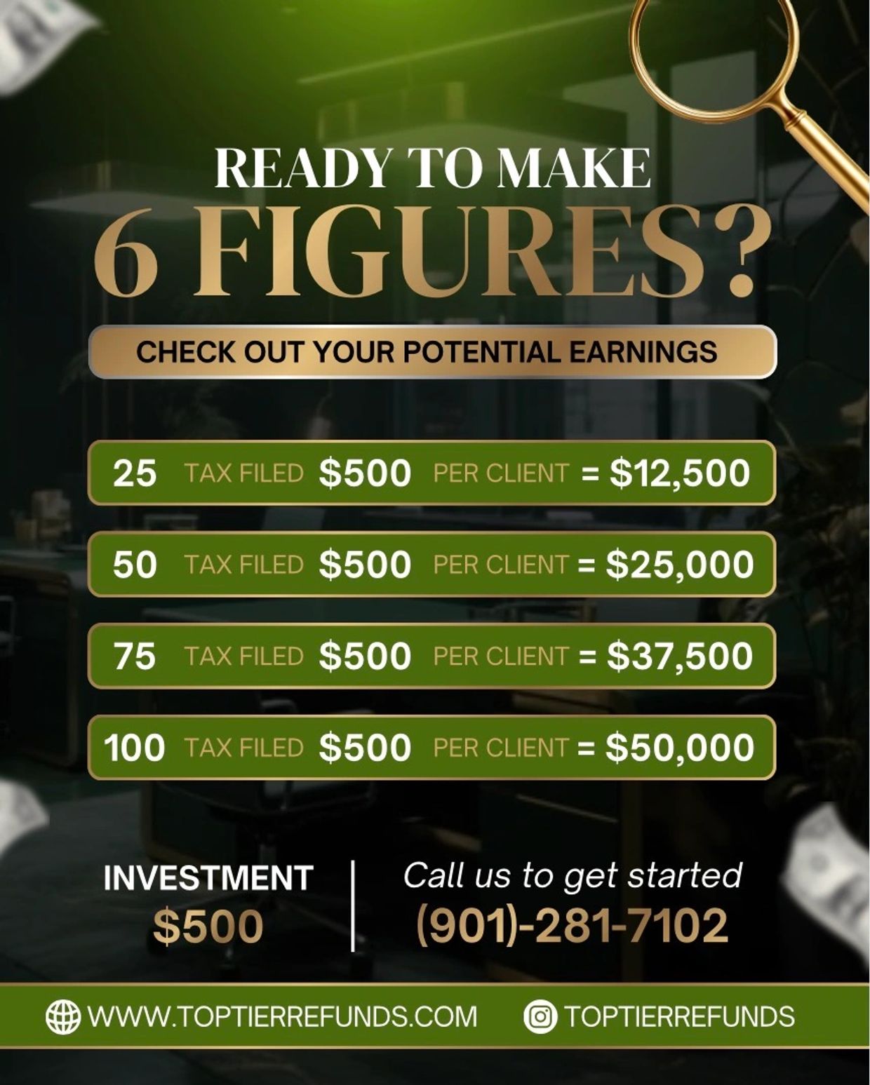 Hello and welcome to Top Tier Refunds! I'm so excited that you are considering joining us for our Fall 2026 Virtual Tax Training. During our 7 - week training we will cover operating your tax business, branding and marketing, filing statuses, standard and itemized deductions, rental income tax preparation, self - employed tax preparation, social security benefits, due diligence, and much more. I hope to see you there!